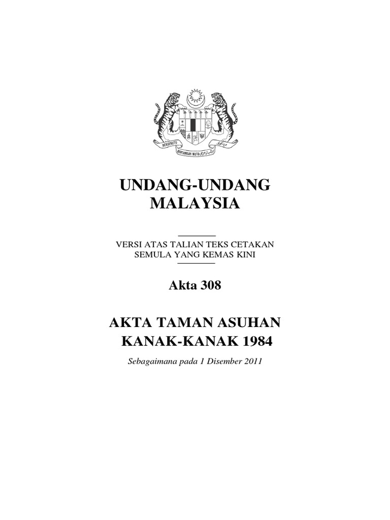 Pengenalan akta taman asuhan kanak kanak 1984 akta 308 tujuan penggubalan adalah untuk mengadakan peruntukan bagi pendaftaran pemeriksaan dan penguatkuasaan ke atas taska dan bagi perkara yang berkaitan dengannya demi menentukan kesejahteraan keselamatan dan perkembangan menyeluruh kanak kanak diutamakan. Negeri lain 1 februari 1986 p u. Akta taman asuhan kanak kanak 1984 syarat tambahan pentauliahan bagi program kemahiran area pengasuhan dan pendidikan awal kanak kanak 2018. 7304 akta taman asuhan kanak kanak 1984 pe r at u r a n pe r at u r a n ta m a n as u h a n ka n a k ka n a k 2012 pa d a menjalankan kuasa yang diberikan oleh seksyen 23 akta taman asuhan kanak kanak 1984 akta 308 menteri membuat peraturan peraturan yang berikut.