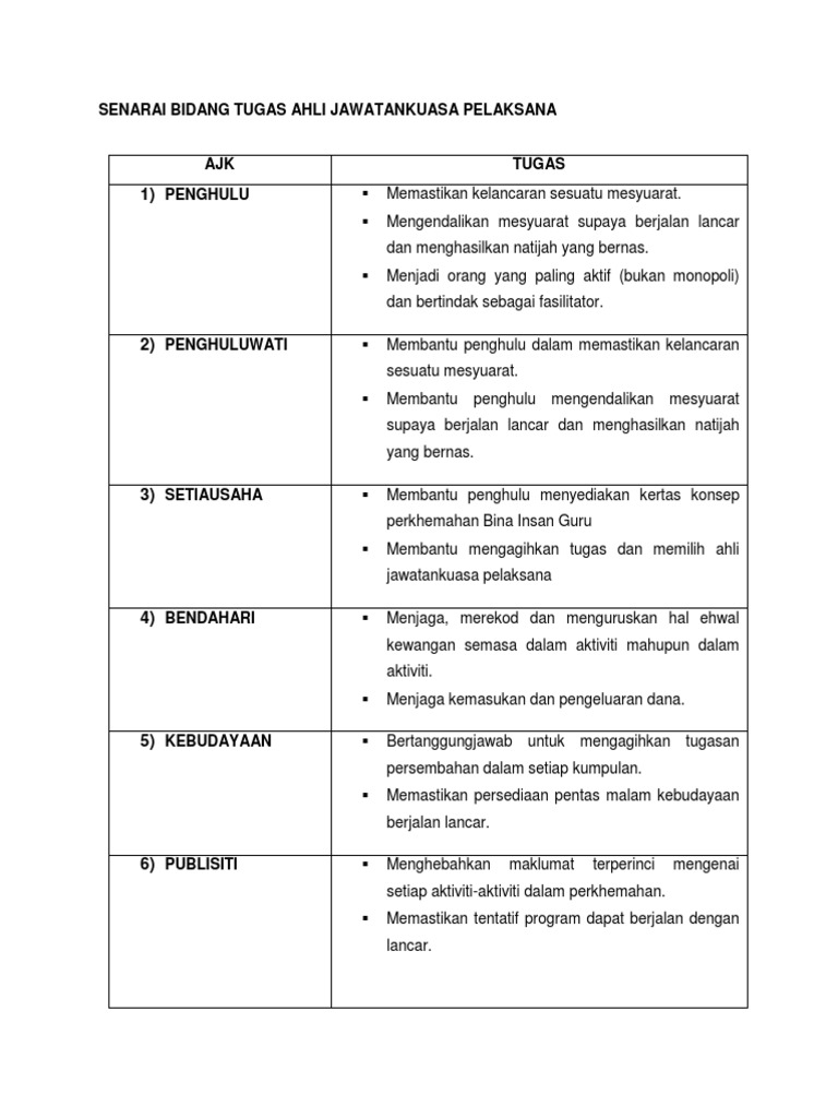 Senarai Tugas Ahli Jawatankuasa