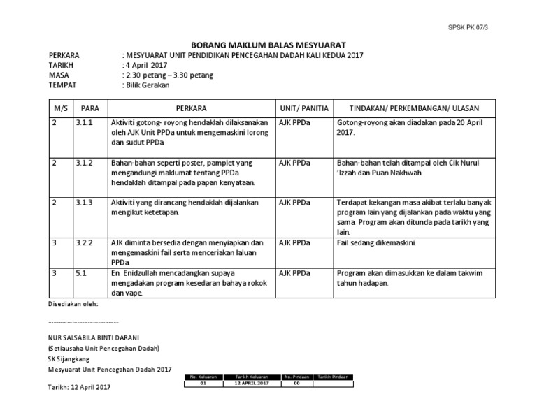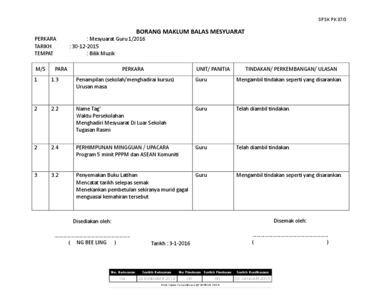 Pk07 3 Borang Maklum Balas Minit Mesyuarat Bil1 2020 Edited Pages 1 5 Text Version Anyflip
