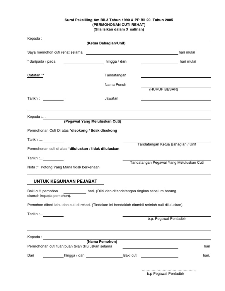 Permohonan C Am 42 Pin 2 91 Permohonan Cuti Rehat Kepada Ketua Jabatan Unit Hari Mulai Daripada Pada Saya Memohon Kebenaran Cuti Rehat Selama Hingga Kepada