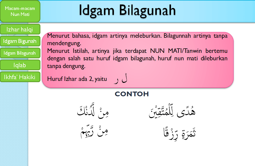 Pengertian hukum idgham bilaghunnah. Contoh contoh idgham bila ghunnah bisa anda lihat pada gambar dibawah ini. Untuk memahami materi tajwid dengan lebih baik terutama bab idgham bila ghunnah maka memahami konsep pengertian idgham bilaghunnah dan contohnya cukup penting. Idgham maknanya yaitu meleburkan menggabungkan satu huruf hijaiyah dalam huruf hijaiyah sesudahnya atau bisa dikatakan dengan kata di tasydid kan.