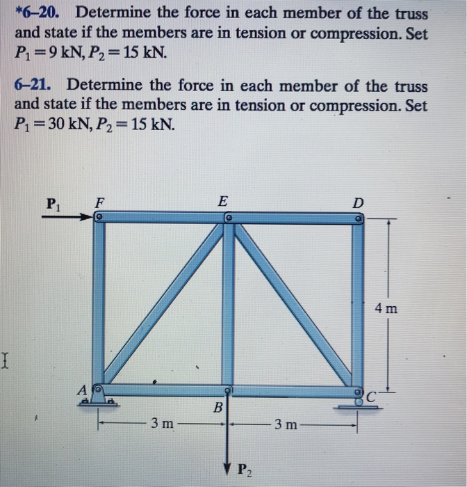 Determine The Force In Each Member Of The Truss And State If The Members Are In Tension Or Compression Setting A P1 20 Kn P2 10 Kn B P1 45 Kn P2 30 Kn All Problem