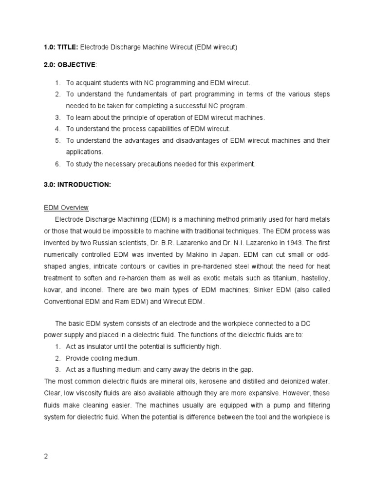 267947862 Edm Wire Cut Report Docx 1 0 Title Production Technology On Non Traditional Machining Electrical Discharge Machining Edm 2 0 Objective To Course Hero