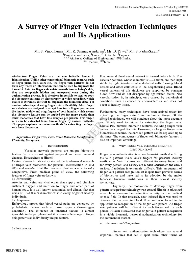 Ijert Ijert A Survey Of Finger Vein Extraction Techniques And Its Applications Support Vector Machine Biometrics