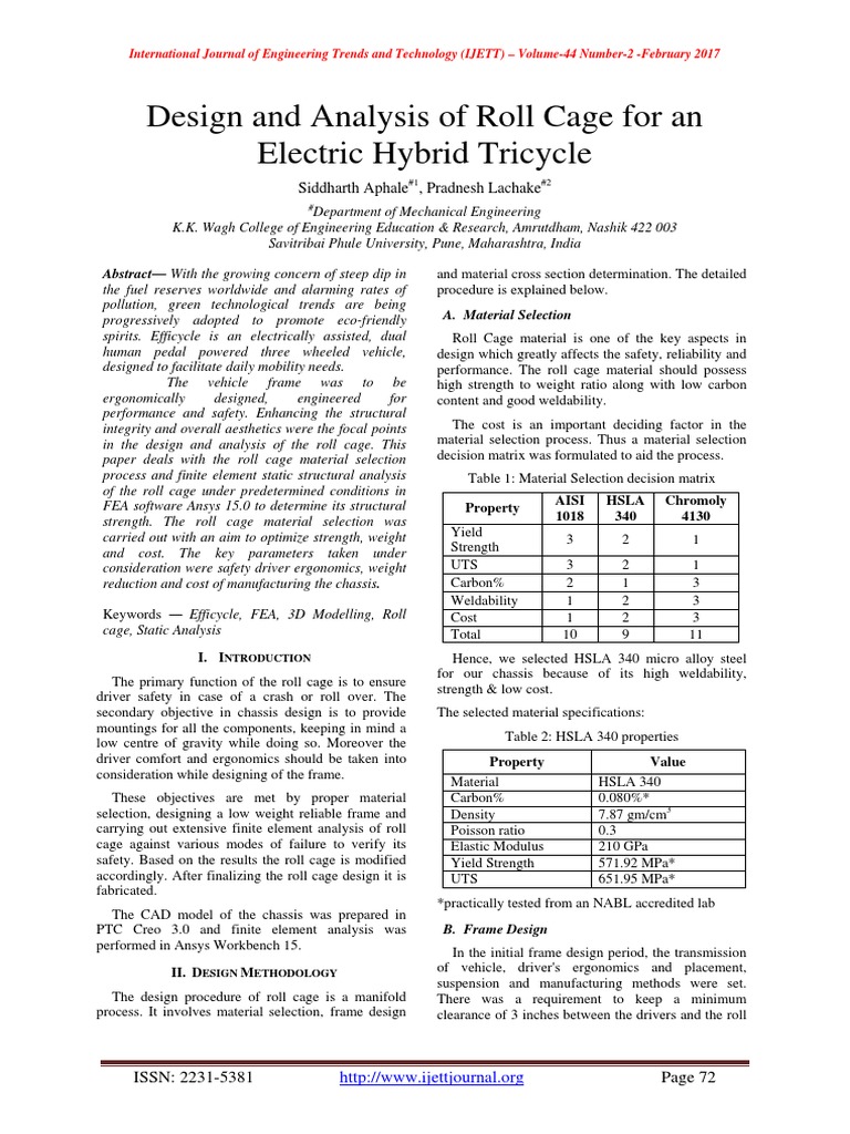 Design And Analysis Of Roll Cage For An Electric Hybrid Tricycle Strength Of Materials Stress Mechanics