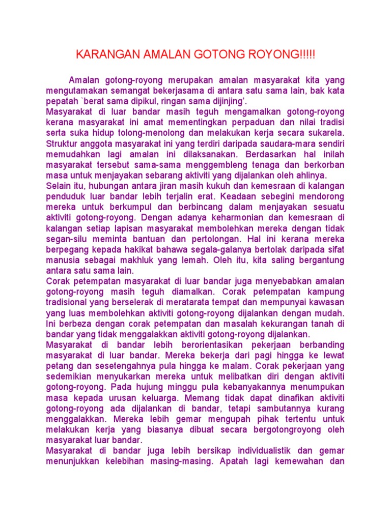 Karangan Kepentingan Gotong Royong Dalam Kalangan Masyarakat Majmuk
