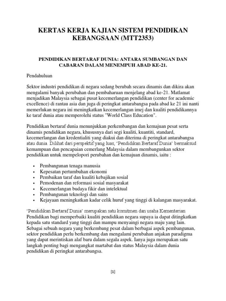Kertas Kerja Kajian Sistem Pendidikan Kebangsaan Pendidikan Bertaraf Dunia Antara Sumbangan Dan Cabaran Dlm Menempuh Abad Ke 21