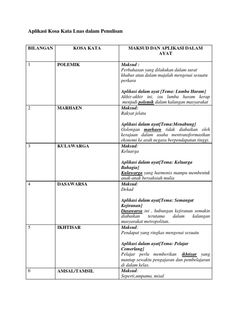 Kosa Kata Maksud Dan Contoh Ayat