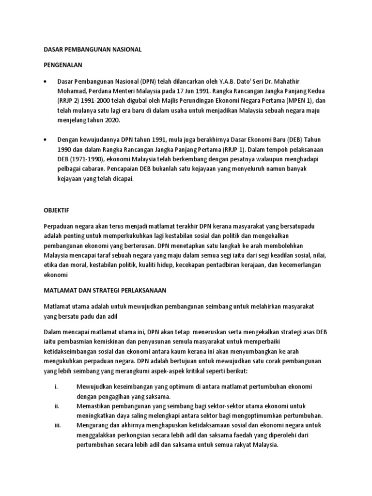 Contoh Soal Dan Contoh Pidato Lengkap Matlamat Dasar Pembangunan Nasional Malaysia 1991