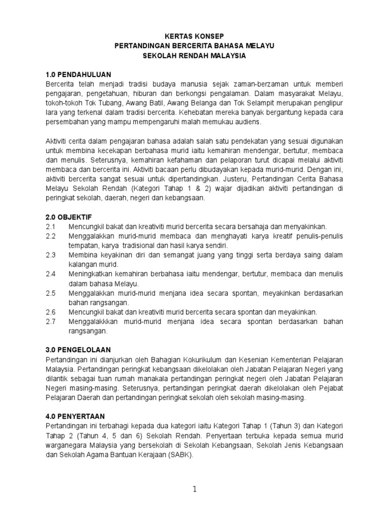 2 0 objektif mencungkil bakat dan kreativiti murid bercerita secara bersahaja dan menyakinkan. Justeru pertandingan cerita bahasa melayu sekolah rendah kategori tahap 1 2 wajar dijadikan aktiviti pertandingan di peringkat sekolah daerah negeri dan kebangsaan. Aktiviti bacaan perlu dibudayakan kepada murid murid. Borang pemarkahan pertandingan bercerita bahasa melayu sk.