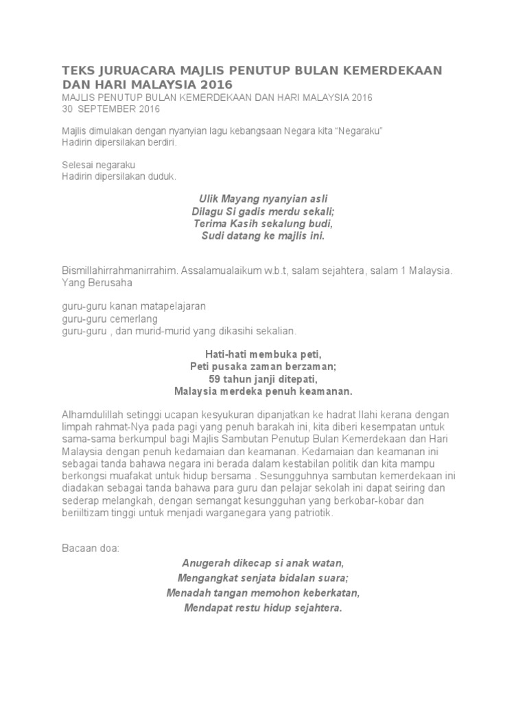 Teks pengacara majlis penutup bulan kemerdekaan. Para hadirin sekalian kita telah pun berada di hujung acara. 1 teks pengacara majlis sambutan bulan kemerdekaan sk kota 2017 para murid yang dikasihi majlis akan bermula sebentar lagi untuk itu diminta semua untuk senyap dan tumpukan perhatian kepada majlis yang akan berlangsung. Memerdekakan diri daripada perkara perkara negatif dan tidak baik amatlah penting. Teks pengacara pelancaran hari kemerdekaan yang ke 57 ulangtahun kemerdekaan malaysia akan tiba beberapa hari je lagi.