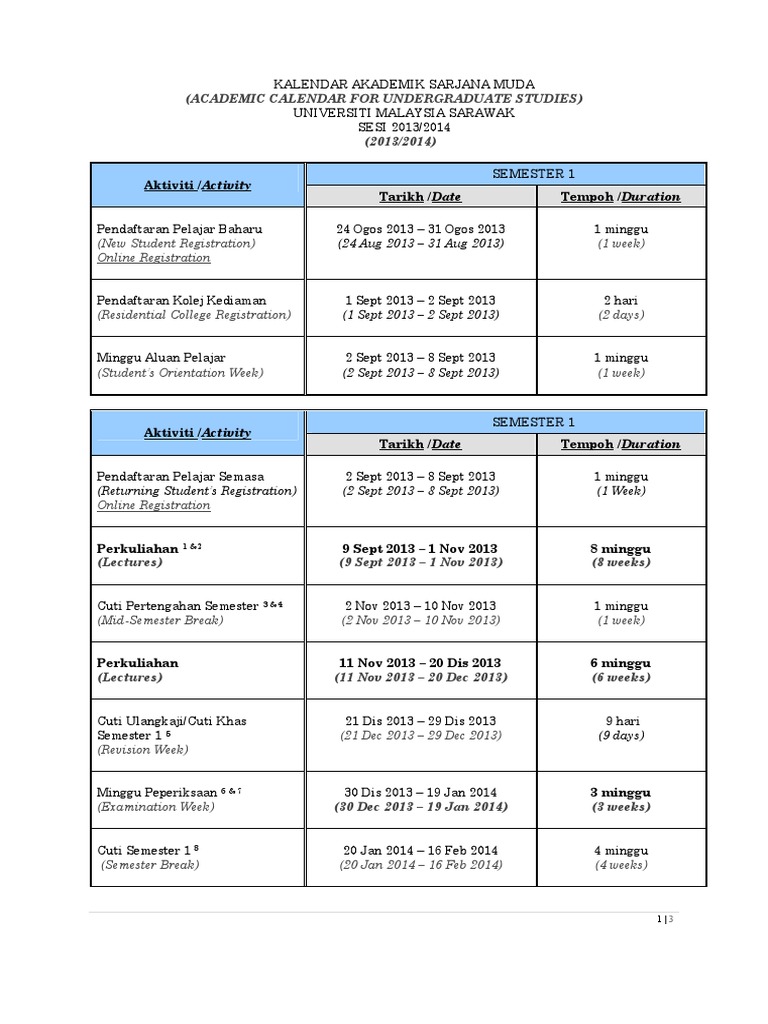 Unimas Undergrad Academic Calendar 20132014 Pdf Academic Term Holidays