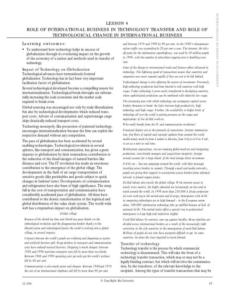 Role Of International Business In Technology Transfer And Role Of Technological Change In International Business Joint Venture Globalization